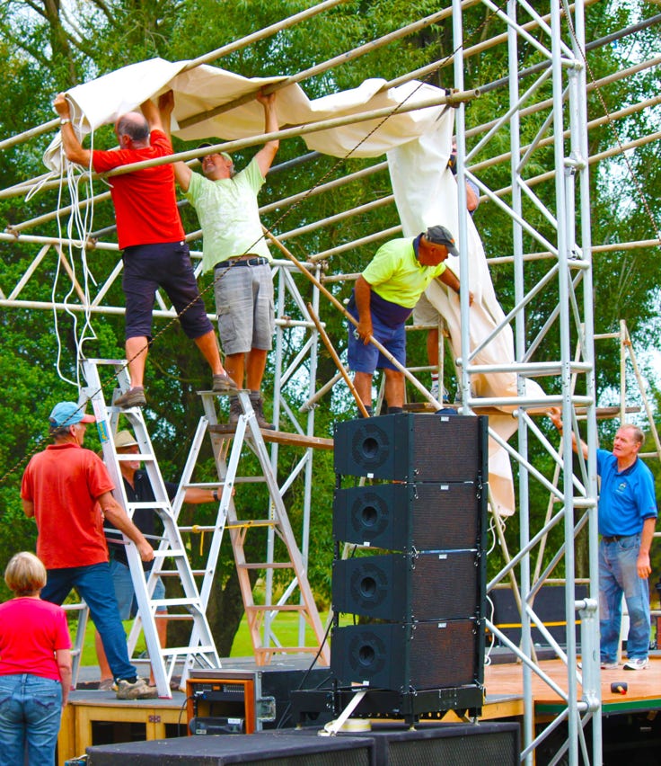 We now put on three concerts every summer on the Haiku Reserve in Katikati. On the morning of the concert – we start at 8am – the trucks and crew roll in and we set up a roof and walls around the stage.